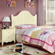A camel-back design with vertical grooves gives charm to this set. The low-post bed shares the same design as the mirror, and like the bed, the rest of the case goods are also finished in cream. The suggested metal bed frame works perfectly with the bed in supporting the mattress.