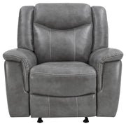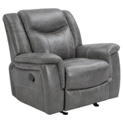 Enjoy superior comfort and smooth motion with this glider recliner chair upholstered in sleek grey faux leather. Designed for everyday relaxation, it features plush padding, overstuffed armrests, and a supportive headrest that enhances lounging comfort. The ergonomic side lever allows quick and easy reclining adjustment, while pocket coil seating and a one-inch cool gel memory foam topper provide exceptional support. Combining luxury and practicality, this recliner delivers the perfect balance of modern design and relaxation._x005F_x000D_ Key Features: • Manual glider recliner chair offers smooth relaxing motion • Grey faux leather upholstery creates a sleek modern look • Plush padded seat, back, and armrests enhance comfort • Ergonomic side lever provides quick easy recline control • Pocket coil seating ensures supportive balanced comfort • Cool gel memory foam topper adds lasting plush softness