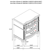 Complete your primary suite with this stunning, glam bedroom set, featuring a lovely platform bed, nightstand, dresser, and mirror combo in a gorgeous silver oak finish with glittering accent panels. The platform bed boasts a beautiful double arch headboard and matching footboard, designed with a channel tufted, foam padded insert upholstered in a soft, ivory fabric that invites you to lean back and relax. Soft, grey, felt-lined top drawers in the dresser and nightstand keep delicates protected, while the nightstand offers a built-in USB port to keep handheld devices charged as you prepare for the day. Slender hexagon-shaped hardware with pearlescent accents adorns each of the curved drawer fronts, allowing you to grab items easily. A double arch framed mirror with a timeless beveled edge offers a contemporary flair and sleek attention to detail. Key Features: • Double arch head and footboards feature lush ivory fabric upholstery with foam padding • Silver oak finish with glimmering accent panels is elegant and modern, delivering a glam finishing touch • Framed beveled mirror creates an instant dressing vanity setup • Hexagonal shaped hardware with pearl-like center accents offer a modern flair • Soft grey felt lining on the top dresser drawers offer space for delicates