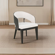 Every curve of this upholstered dining arm chair is a gesture of quiet sophistication. Its sculpted frame, finished in a deep burnished black, cradles a generously cushioned seat and softly wrapped backrest in creamy fabric. The open barrel design invites relaxed posture, while the smooth sweep of the arms lends an effortless sense of grace. Perfect for gathering, lingering, and savoring, this chair brings poetry to the table. Key Features: • Upholstered arm chair with sculptural barrel back and soft flared silhouette • Cream fabric contrasts beautifully with the burnished black wood frame • Curved backrest hugs the form while creating a light, open-arm profile • Foam-padded seat and back offer comfort for extended dining and gathering • Crafted from rubberwood, engineered wood, and textured polyester fabric • Designed to blend modern grace with an inviting, timeless presence