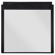 A rich black finish create a sophisticated palette for a four-piece modern bedroom set. Complete with wire brushing that creates texture, the set features fluted details that add elegance and character. The bed features an open silhouette with a low footboard, while a tall headboard centers your space. A two-drawer nightstand includes a felt lined top drawer to protect delicates like your watch or phone, leaving plenty of space in the bottom drawer for books and other essentials. The dresser and mirror set completes the look, offering plenty of storage in eight drawers, including felt lining in the top two, for clothing and accessories. Key Features: • Stylish and modern, a contemporary wood bedroom set features a wire brushed black finish • Square headboard and footboard create a complementary pairing and open silhouette • Fluted texturing highlights the bed, nightstand, dresser and mirror • Drawers feature demi-lune metal handles in a warm golden tone for sophisticated contrast • Bed includes slats with support legs to provide an excellent base for your mattress set • Drawers feature English dovetail joinery for excellent craftsmanship