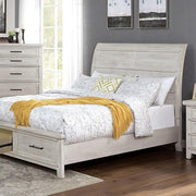 SHAWNETTE Cal.King Bed, 97"L X 81 3/4"W X 56"H, 246.4lbs. One could be reminded of winter with this gorgeous antique white bed. The sturdy wood construction features a curved plank style headboard and two storage drawers built into the footboard. It's a grand addition to any bedroom - one that makes a statement.
