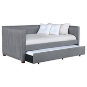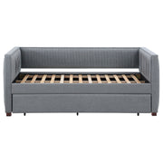 A gray fabric, pleated and overlapping along the surface of this twin daybed and trundle set, create a textured appearance against the clean straight lines. The narrow arms and backrest invite you to get creative with your own accent pillows and throws, opening this furniture piece up to becoming a lounge sofa or a bed for additional overnight guests. A trundle slips beneath the main frame when not in use or can be retrieved and glided out effortlessly. Black finish feet add slight elevation and a pop of contrast against flooring and rugs too. This twin daybed trundle set is the perfect addition for compact, multipurpose spaces like home offices and guestrooms. Key Features: • With its thin, pleated, fabric details, this shelter back daybed features exceptional tailoring throughout • Relax in comfort with this sleeping, lounging, daybed must-have • Perfect for smaller living areas, convenient pull out trundle for extra sleeping space when needed • Upholstered in grey fabric • Frame constructed with pine and MDF • Slat kits included