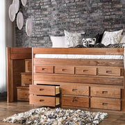 Completely do away with the need for case good and open up the room for activities with this space saving marvel. Three rows of shelves line the side of this loft bed, and to add even more storage the staircase features pull out drawers. The entire piece is stain in mahogany for a rich warm tone.
