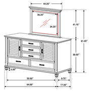 Introduce rustic elegance to your sleeping quarters with this spacious dresser, crafted from exceptional New Zealand pine with an antique white finish. The five soft-closing drawers and two side cabinets with shutter-style panels provide ample storage, accented by detailed crown molding and molded tapered legs. Pair it with the matching weathered sage mirror, its large rectangular shape and crown molding accents creating an enchanting prep spot atop the dresser, adding a touch of rustic flair and stylish impact to your room.