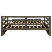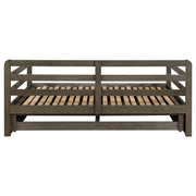Bring function and fashion to your sleep space with this wood storage sleeper daybed. It is fashioned with pine, plywood, and MDF and is mattress-ready (no foundation required). Bed showcases storage footboard with two built-in drawers for linens and other items. You'll love the convenient fully slatted pull-out sleeper when guests stay over. It's perfect for any sleep space and is versatile enough for a tight living space like a loft, as well. Key Features: • Rustic twin XL daybed with trundle in grey finish • Trundle extends to accommodate second twin mattress (6” mattress recommended) • Trundle includes two (2) storage drawers • Pine, plywood, and MDF construction • Slat kits included