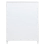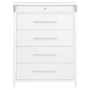 This five-drawer chest blends soft curvature with bold contemporary details for a refined bedroom centerpiece. Elongated brushed nickel pulls and sleek metal tube accents lend a striking gleam, while rounded corners offer a softened modern edge. Crafted from solid rubberwood, engineered wood, and fabric-lined interiors, each drawer glides smoothly on heavy-duty metal runners. A perfect fusion of design and daily utility, it’s ideal for modern spaces of any style. Key Features: • Five-drawer chest with curved edges and clean profile for modern bedroom storage • White finish complements brushed nickel pulls and metal tube detailing • Felt-lined top drawer with tinted interior and dovetail joints for refined function • French dovetail front and English dovetail back drawers glide on 45mm metal runners • Constructed from solid rubberwood, engineered wood, and soft fabric lining • Fully assembled design includes tip-over restraint system for added safety