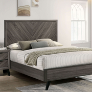 Something about this bed's cool gray finish and chevron grain pattern gives it a stylish vibe. The diagonal replicated grain meet at the center line, forming a V-shaped pattern found on the headboard and front panels. Contemporary elements continue throughout this ensemble, with the black angled legs and sleek finger pulls found on the matching case goods. Coordinating pieces like this set offer a stress-free experience in updating your bedroom decor.