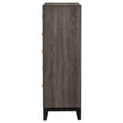 Complete a retro motif with the fine details and color blocking from this grey five-drawer chest. Constructed of oak, the body showcases a light, exposed wood grain that oozes sophistication. Tapered legs in a black finish offer a modern feel, adding visual intrigue with neutral hues. Bright and metallic, light drawer pulls curve off the flat drawer fronts in a half moon shape. A contemporary take on mid-century modern design, add fun flair to an up-to-date scheme. Key Features: • Transitional style bedroom at a great value • Nickel finished hardware highlights two-tone grey oak finish • Black grooves create a dimensional look • Three-dimensional engineered foil paper veneer in grey oak and black • English dovetail drawer construction • Black finish legs are crafted of solid hardwood