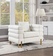 Let this chic and comfy set bring excitement and personality to your living room. Not only is the silhouette fun, inviting, and unique, but the fabric itself is a statement of its own. Bright white boucle fabric wraps around the piece, filling every deep horizontal tuft. Tall tuxedo-like arms and backrest cradle the lengthy bench-style seat cushion between. Gold-plated steel legs is the proverbial cherry on top of this decidedly alluring piece.