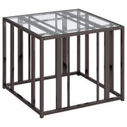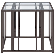 This coffee table set includes a rectangular coffee table and a matching end table, both featuring tempered glass tops and geometric bases crafted from heavy-gauge metal. The open-frame design exudes modern elegance while offering durability and functionality. Scratch-resistant materials ensure lasting quality, making the set ideal for organizing essentials or displaying decor. Its cohesive design provides a sleek, contemporary look for any living room.