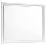 Get ready to add exquisite glamour to your space with this white upholstered bedroom set. The dramatic headboard offers incredible contemporary appeal with velvet upholstery, button tufting, crystal-like accents and hand-applied nailhead trim with a chrome finish. The matching nightstand comes equipped with a crocodile textured door panel and a glimmery chrome top drawer panel. The seven-drawer dresser with mirror and optional five-drawer chest offers the same texture and sparkly finish. Sleek chrome bar pulls perfectly complement the tapered legs on the panel bed and the bun style feet for the storage pieces.