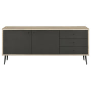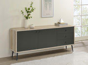 Light, airy energy and minimalist Scandi design combine to create a chic storage solution for any room. A modern accent cabinet features a pine wood finish case that's cool and neutral, perfect for a living or dining room. Door and drawer fronts add a contrasting antique gray finish that's rich and elegant, offering contrasting color and style for a stand-out look. Two doors open to reveal two shelves, great for everything from dinnerware to clothing and accessories. Three drawers create the perfect spot for smaller items, adding organization in an entry or home office. Key Features: • Light, airy energy and minimalist Scandi design for chic storage • Pine wood finish case with contrasting antique gray door and drawer fronts • Two doors open to reveal two shelves for dinnerware, clothing, and accessories • Three drawers for organizing smaller items in an entry or home office • Rich, elegant look perfect for living or dining room