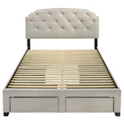 Indulge in comfort and utility with this platform storage bed, where graceful design meets everyday practicality. A tufted velvet headboard with gentle curves and nailhead trim brings refined elegance, while four built-in drawers offer generous hidden storage. Expertly crafted from rubberwood, engineered wood, and foam, this fully slatted frame eliminates the need for a foundation. It's a sophisticated solution for streamlined, serene living. Key Features: • Queen platform bed with scalloped tufted headboard for graceful tailored dimension • Cream velvet upholstery with button tufting and nickel nailhead trim for elegance • Includes four spacious drawers for concealed clothing or linen storage solutions • Fully slatted base supports mattress directly with no foundation or box spring • Built from rubberwood and engineered wood for stability, durability, and strength • Foam-filled headboard adds comfort while combining classic detail with function