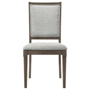 Elevate your dining space with this beautifully crafted dining chair, blending intricate detailing with luxurious comfort. The chair features a molded geometric design on the backrest, offering a striking visual appeal. Constructed from solid wood and embossed, this chair is finished in a dark brown hue, adding warmth to any dining room. The seat and front of the backrest are upholstered in a soft, textured grey fabric, providing both style and comfort. Whether used as a dining chair or an accent piece, this chair is sure to make a statement. Key Features: • Dining side chair with padded seat and backrest for a comfortable dining experience • Finished in a dark brown tone, bringing warmth to any room • Molded geometric design on the backrest adds visual texture and elegance • Sleek and versatile design suitable for modern or transitional spaces • Sturdy construction with solid wood and embossed mdf ensures durability