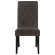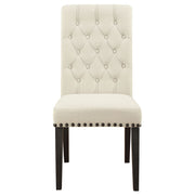 Blending timeless elegance with plush comfort, this side chair enhances any dining space. Its high backrest features a classic button-tufted design, adding depth and sophistication. A rolled top and hand-applied nailhead trim create refined detailing, while the generously padded seat ensures lasting comfort. Supported by sturdy, tapered legs, this chair is built for both beauty and durability. Whether part of a formal setting or an inviting everyday dining space, it brings grace and charm to the table. Key Features: • Side chair with a button-tufted high back and elegant rolled top • Soft beige linen-like fabric upholstery enhances classic appeal • Nailhead trim adds refined detailing to the chair’s silhouette • Espresso finished tapered legs provide strength and stability • Generously padded seat ensures superior dining comfort • Timeless design complements traditional and transitional spaces