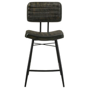 With a hint of ranch inspiration, the design of this five-piece counter height dining set is a brilliant choice for an easy, casual living space. Indulge in a calm vibe with a set anchored by a natural finish sheesham table featuring a spacious rectangular top and tapered, rounded legs. A dark apron with geometric design detail adds an exotic effect. Mid-Century Modern influence adds to four comfortable counter stools with scoop seats and a thick back, both with horizontally channeled leather upholstery. Metal framing features iconic retro slender rounded, splayed legs.