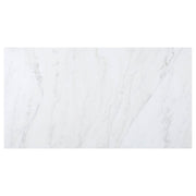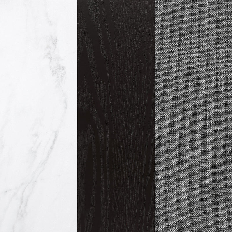 Bring together family and friends at this modern rustic style dining table set. The table features a rectangular, thick, white marble top that is spacious enough for six people. Sleek open and airy trestle base with a center punch out, rustic espresso striking color combination lends a dramatic touch and grounds the room elegantly. The set of chairs with a rolled backrest with button-tufted details lends a traditional aesthetic to a space. Also, bringing to your home the classic elements is a padded seat with individual nailhead trim that offers a charming detail.