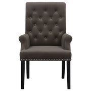 Bring together family and friends at this modern rustic style dining table set. The table features a rectangular, thick, white marble top that is spacious enough for six people. Sleek open and airy trestle base with a center punch out, rustic espresso striking color combination lends a dramatic touch and grounds the room elegantly. The set of chairs with a rolled backrest with button-tufted details lends a traditional aesthetic to a space. Also, bringing to your home the classic elements is a padded seat with individual nailhead trim that offers a charming detail.