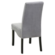 From the Stanton Collection, this wood and fabric side chair has a cheerfully padded seat and backrest. The flared back cuts a dashing silhouette that's also good for relaxing. Featuring grey fabric upholstery and leg finish in black, it's a classic complement to the contemporary dining table from the same collection. This side chair is comfortable enough for lingering over after-dinner conversation or coffee. Sturdy construction and slightly angled legs make it stand up to everyday use. Key Features: • Velvet dining chair features flared high backrest for sleek modern profile and ergonomic support • Grey polyester upholstery offers soft texture and versatile tone for updated dining rooms • Padded seat and backrest provide comfort for extended meals or casual gatherings • Black wood legs contrast elegantly with the soft grey velvet for a refined finish • Subtle stitching along the seat back adds tailored visual detail • Constructed from solid wood, foam, and fabric for durability and comfort