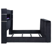 This innovative wingback bed levels up a top-selling design with bold tech upgrades and plush texture. A hidden motorized TV mount rises from the footboard via remote control, supporting screens up to 50 inches and tucking neatly away when not in use. The headboard’s flame visualizer glows over shimmering crystal rocks with sixteen color settings. Dual USB-A and USB-C ports on each side keep devices powered. Upholstered in soft, faux fur-style corduroy over a solid pine frame. Key Features: • Queen wingback bed upgraded with motorized TV lift in footboard and remote-controlled flame box • Plush black faux fur-like corduroy fabric delivers striking, tactile softness and bold style • Hidden footboard TV rack accommodates up to fifty-inch flat screens with smooth lift • Headboard includes crystal flame visualizer with sixteen color options and no heat output • Dual USB-A and USB-C ports on each side of headboard provide fast, convenient charging • Solid pine frame and seven-foot electrical cord ensure reliable structure and easy power access