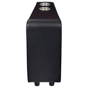 Modern home theater seats are bound to bring the movie experience to your home. Choose your custom configuration of black home theater seats, upholstered in leatherette. Slim track armrests give the chairs stylish appeal along with tufted backrests. Consider the optional consoles to go between each seat and serve as a cup holder. Choose this home theater recliner set to elevate your next home theater adventure.