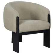 Bring updated style and sophistication to your living room or den with a modern accent armchair. It boasts an inviting rounded silhouette with sloping arms. Three legs in a black finish add a sculptural sensibility. Textured boucle upholstery creates rich texture and depth, perfect for entertaining or lounging. Enjoy the plush softness of foam cushions in any setting.