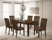 GARNETT Dining Table, 65"L X 35 3/8"W X 29 3/4"H, 88lbs. Sometimes, sophistication comes in simple packages with outstanding details. There is nothing too out-of-the-ordinary about this dining collection, besides the fact that the chairs feature a unique spine-like construction, which brings an unexpected twist to the standard back design. Seat cushions are upholstered in leatherette and the whole set is finished in a lovely, warm walnut color.