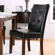Throw the ultimate dinner party with this brown cherry finished table! The genuine marble top gives a charming visual while offering enough space for up to seven adults. Friends and family are seated comfortably in the matching leatherette parson chairs.