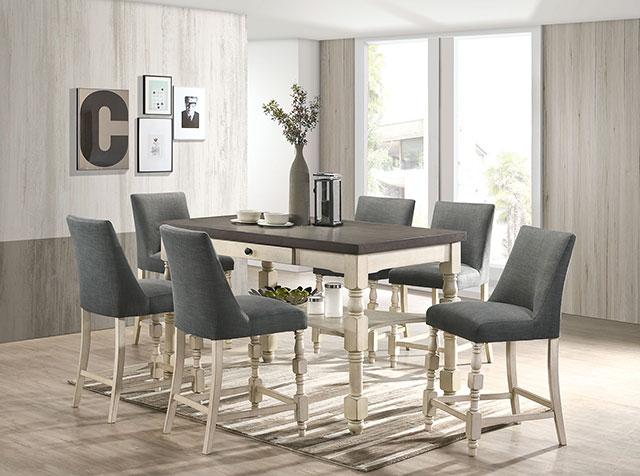 PLYMOUTH Counter Ht. Table, 60"L X 29 7/8"W X 37 3/4"H, 145.2lbs. Create a sense of comfort with this vintage ivory and dark gray table supported by turned legs. A sole storage drawer offers easy access to utensils, while the open bottom shelf is the perfect spot to display and conveniently store dinner wares. The matching bench and chairs are padded and upholstered in gray fabric, which offer a nice contrast to the lighter wood finish.
