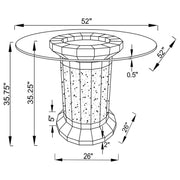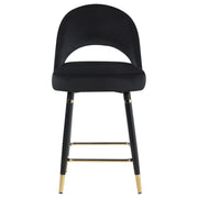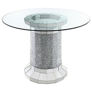 Perfect for contemporary entertainment areas, this chic, modern, glam counter height set hosts four guests comfortably. A round, clear glass top and round, column-inspired pedestal base float elegantly within your spacious room or breakfast nook. The pedestal table base boasts a brilliant faux diamond inlay and mirror tile that shimmers stunningly. Four counter height chairs feature open rounded backs upholstered in soft and smooth velvet for extra comfort and support. Each seat rests on slender legs, complete with golden metallic accents and a sturdy footrest for a dramatic contrast and glam touch.