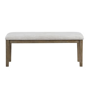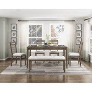 Create a warm and inviting dining space with the light brown six-piece dining set. This complete set includes a spacious rectangular dining table, four comfortable chairs, and a versatile bench, providing ample seating for family meals and gatherings. Crafted with durable oak veneer, wood, and engineered wood in a warm light brown finish, this set offers both style and lasting quality. Each chair and the bench feature a fabric-upholstered seat cushion, ensuring comfortable seating for everyone. Perfect for everyday dining and entertaining, this six-piece set is a stylish and practical addition to any home. Please note that assembly is required upon arrival. Weights & Dimensions Overall Gross Weight: 154.00 lbs Overall Net Weight: 132.00 lbs Overall Dimension: Table: 35 x 58 x 30.5H, Chair: 17.5 x 21 x 37.5H, Bench: 48 x 16 x 19.5H TABLE: 58 x35 x30.5 CHAIR: 17.5x21x37.5 BENCH: 48x16x19.5 Apron to floor: 26.5" Distance between legs from the shorter side: 31.5" Distance between legs from the longer side: 54.5" Chair Seat Width: 17.5" Chair Seat Depth: 16.5" Chair Seat Height: 19.5" Product Details Includes 1 dining room table, 4 chairs and 1 bench Made of Oak veneer, wood and engineered wood Light brown finish Fabric upholstered seat cushion Seats 6 Assembly required Fabric Type: Textured Fabric Color: Gray Fabric Content: 100% polyester Fabric Cleaning Code: Upholstery (S) Packaging Number of Boxes: 1 Overall CuFt: 16.8367 Package Dimension: 61.25 x 38 x 12.5H Piece per Carton: 1