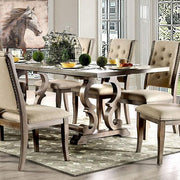 Patience Rustic Natural Tone Dining Table, 90"(1 X 18" LEAF)L X 40"W X 30"H, 167.2lbs. Your dining area says something about you, and this dining collection says that you're welcoming, warm, and generous. The soft natural tone finish of the wood is enough to put anyone at ease, but combined with a button tufted chair, you'll have friends and family relaxed and enjoying their meal for hours. The trestle table base is delicately curved and offers your relaxed aura a touch of sophistication and class without being too intimidating. Features: Trestle Style Base Padded Fabric Chairs Button Tufted, Nailhead Trim Saber Style Chair Legs