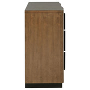 Add a stylish platform for decor and ample storage for clothing with a modern six-drawer dresser. Crafted with a cool ash brown wood grain finish, the dresser features decorative drawer fronts that turn it into a true show piece in your bedroom. Drawer fronts are subtly shaped and paired with vertical fluting that creates chic depth in an artful presentation. Thick bar pulls are turned vertical, echoing the elegant lines of the piece. Its wide top is just right for a jewelry box and decor, offering a personalized ambiance to your bedroom. Key Features: • Six roomy drawers in a modern wooden dresser create ample storage for clothing, linens, and more • An elegant cool ash brown wood finish is complemented with deep brown-toned hardware • Vertical fluting lends texture and dimensionality that creates sophisticated artistry • Vertical drawer pulls add visual interest and dimensionality to a shapely drawer front design • Drawers feature metal extension glides for smooth, seamless performance