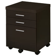 Stay organized in style with this mobile file cabinet, designed for both functionality and modern appeal. Featuring a rich cappuccino finish, this compact storage solution seamlessly blends into any home or office setup. Two spacious drawers and a file compartment provide ample space for documents, supplies, and office essentials. The built-in casters ensure smooth mobility, allowing for effortless repositioning. Sleek silver hardware accents add a contemporary touch, while its durable engineered wood construction ensures lasting use. Key Features: • Sleek mobile file cabinet with a modern cappuccino finish • Two drawers and a file compartment for organized document storage • Designed to accommodate both legal and letter-size files • Smooth-rolling casters provide effortless mobility in any office space • Durable MDF and engineered wood construction for long-lasting use • Sleek silver handles enhance the cabinet’s contemporary design