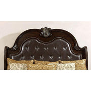 The bold look of this collection boasts an elegantly traditional design. A tall camelback headboard with button tufted leatherette upholstery is in the perfect contrast to the sleigh style footboard. Matching case goods feature genuine marble tops, felt-lined top drawers and full extension metal glides.