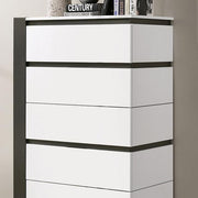 BIRSFELDEN Chest, White, 31 1/2"W X 17 7/8"D X 47 5/8"H, 157lbs. Just one look, and there is no doubt where this chest belongs--in a modern home. For starters, a striking two-tone design is produced by allowing large blocks of high gloss white to be interrupted by dark, metallic gray gaps. The panels all feature this bold color contrast. True to modern pieces, drawer handles are out of sight, as the gaps serve as concealed pulls as well. Look closer, and you'll notice how the gaps themselves are not even in width; this purposeful asymmetry adds more to the appeal and modern vibe.