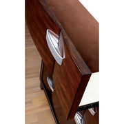 The perfect collection to declutter and organize while maintaining style. This brown cherry finished chest showcases unique geometric woodwork for a modern charm. Silver trim accents and matching silver drawer pulls add a faint glamorous touch to brighten up your room!