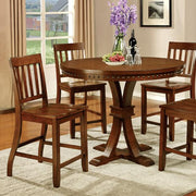 Make your dining room unique with this pedestal table decorated with nail head trim. Matching slated chairs accompany this table.