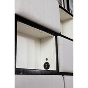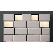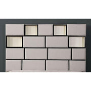 Gemma Beige/Black Cal.King Bed This is an absolutely dazzling bed. The sectional panels up fabric upholstering make for an unforgettable visual, and the soft LED light-up is reminiscent of a backlight window. Set up stunning silhouette displays in the open shelves and rest comfort able in the coziness of this extravagant bed. Features: Contemporary Beige Fabric, Wood, Others Padded Fabric Display Headboard LED Touch Lights Built-in USB Outlet