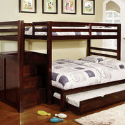 This space saving twin over twin bunk bed offers a great value. A full staircase leads to the upper bunk, while storage drawers are built under the staircase for optimal storage space. The bed framework is constructed of solid wood and finished in dark walnut.