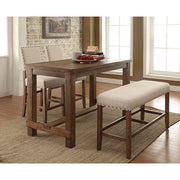 Designed with convenience and style in mind, this rustic dining collection is a gorgeous addition to any environment. The paired coloring between natural toned wood and ivory linen-like upholstery creates a bright and inviting atmosphere for a space-conscious studio or loft. The plank style surface offers ample room while adding emphasis to the solid wood construction. Available with chair or bench options.