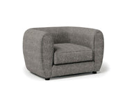This compact living room ensemble is full of welcomed surprises. The tall arms and low back is an obvious homage to the tuxedo style, but the bulbous shape and smoother lines is a unique twist taking inspiration from the modern era. Underneath the seat cushions are high density foam, making firmer seats than one would expect for the shape that it is in. Finally, soft boucle fabric wraps around the whole piece highlighting a certain air of elegance and quiet class.