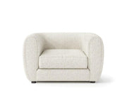 This compact living room ensemble is full of welcomed surprises. The tall arms and low back is an obvious homage to the tuxedo style, but the bulbous shape and smoother lines is a unique twist taking inspiration from the modern era. Underneath the seat cushions are high density foam, making firmer seats than one would expect for the shape that it is in. Finally, soft boucle fabric wraps around the whole piece highlighting a certain air of elegance and quiet class.