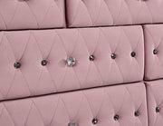 ZOHAR Dresser, Pink, 58 1/2"W X 17 1/2"D X 36"H, 136.4lbs. Showcase your personal taste with this bold statement piece in your bedroom. Fully upholstered in flannelette, this dresser features eye-catching tufting. The padded fabric and crystal buttons continue all throughout the drawers. Each drawer handle is made of glistening acrylic crystals, while silver-painted cabriole legs are perfect in bringing in majestic vibes.