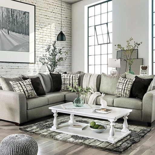 The plush, contemporary, pillow-back Walter Sectional features light gray linen-like upholstery and a versatile L-shaped design. Included contrasti...