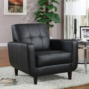 Redefine your seating space with this versatile accent chair that bridges modern and mid-century design. Upholstered in smooth black leatherette, it features decorative tufted stitching across the backrest and seat for a refined touch. The padded cushions deliver everyday comfort, while track arms emphasize its clean silhouette. Tapered cappuccino-finished legs lend subtle warmth and stability, making this chair a stylish addition to a living room, office, or bedroom. Crafted for both durability and charm, it offers timeless appeal._x005F_x000D_ Key Features: • Accent chair upholstered in smooth black leatherette for modern appeal • Decorative tufted stitching on seat and backrest enhances refined detail • Plush padded cushions provide lasting comfort for everyday lounging • Track armrests emphasize the clean contemporary silhouette design • Tapered cappuccino-finished legs add warmth and supportive stability • Crafted with Asian hardwood, eucalyptus, foam, and leatherette for durability