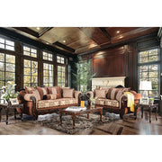 Beauty and strength in one, this collection offers a gorgeous seating choice for any parlor. Pecan brown upholstery comes accented with beige coloring to place emphasis on the warm brown tones. Solid wood framework ensures stability and durability while high density foam cushions provide comfortable padding. Loose back pillows featuring fringe trim and mesmerizing patterns add that extra bit of detail to raise this loveseat and sofa set to the next level.