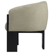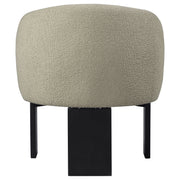 Bring updated style and sophistication to your living room or den with a modern accent armchair. It boasts an inviting rounded silhouette with sloping arms. Three legs in a black finish add a sculptural sensibility. Textured boucle upholstery creates rich texture and depth, perfect for entertaining or lounging. Enjoy the plush softness of foam cushions in any setting.