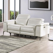 There is no compromising comfort even with a living room ensemble as stylish as this one. Supported atop tall, metal legs, each piece showcases contemporary style from their wide waterfall style arms and sleek tight backs all upholstered in a sleek kind of breathable leatherette. Discreet reclining functionality is offered with plush cushions on the footrest and headrest that both recline and retract with a push of a button. Whether you need it for its remarkably stylish looks or undeniable comfort, you cant go wrong with these spectacular pieces for your living room.